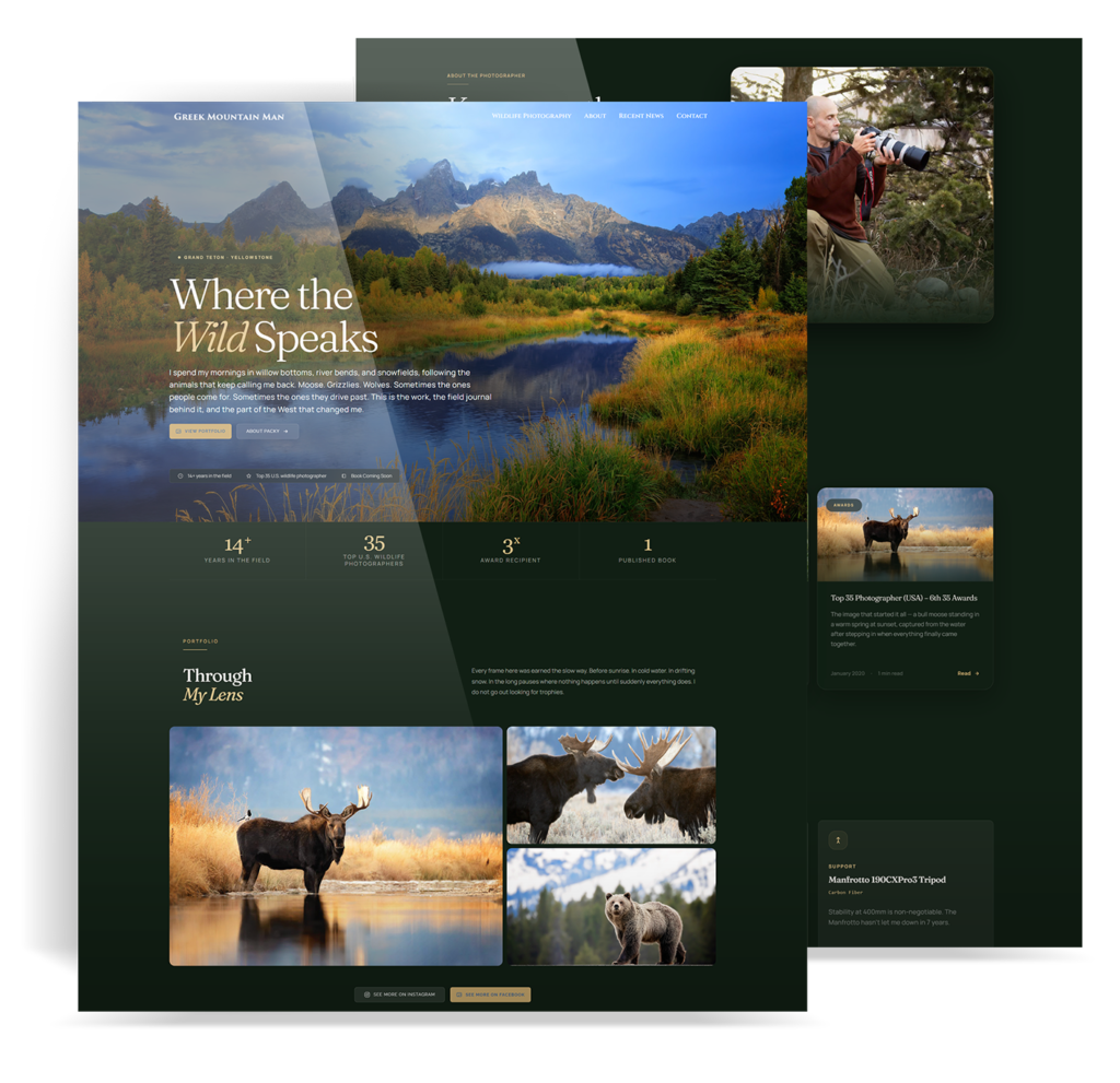 Greek Mountain Man already had strong material. The problem was shaping it into a better experience. The site needed to move cleanly from hero to photography, animal stories, about, field journal, gear, book, workshops, and contact without feeling like a stack of unrelated sections. It also needed a sharper visual system that could feel premium without getting in the way of the photography or the writing.